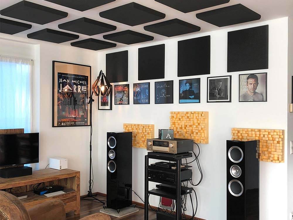 For at forbedre akustikken i rummet, anvendes forskellige lydabsorbere til støjdæmpning. Derved forhindres rungen fra bas eller flutter-ekkoer og anlægget og boksene kan folde hele deres klangpotentiale ud.