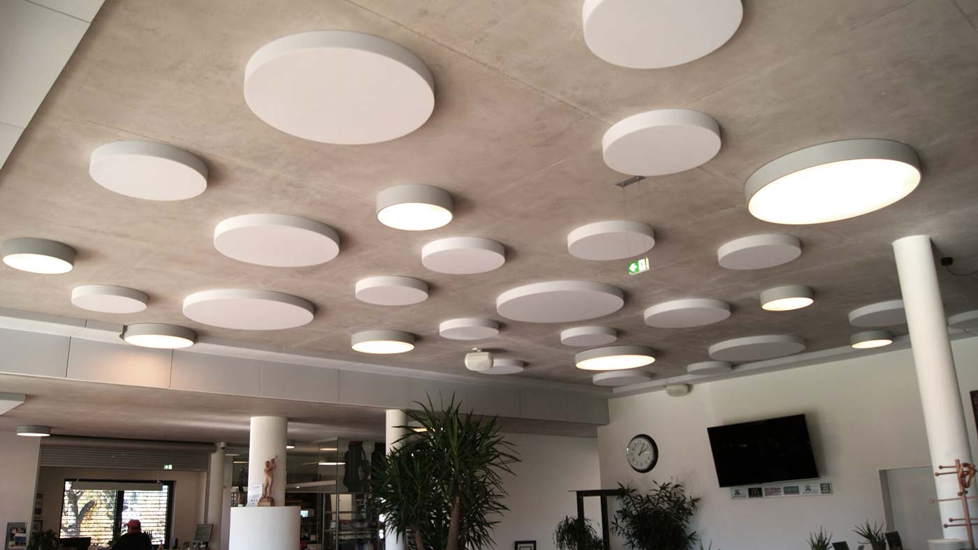 Alternativt har aixFOAM en række forskellige akustiske elementer til loftet, som kan klæbes direkte på loftet eller hænges op ved hjælp af et enkelt rammesystem. I forbindelse med akustiklofter er kvadratiske lydabsorbenter med skrå kanter særligt velegnede til reduktion af efterklangstiden. Lydabsorbenter med glat overflade egner sig bedst til montering med skyggefuge.
