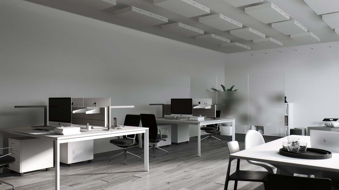 Du kan klæbe vores akustikplader på loftet eller ganske enkelt hænge dem ned fra loftet ved hjælp af vores akustikrammer. Få mere at vide om vores monteringsmuligheder.